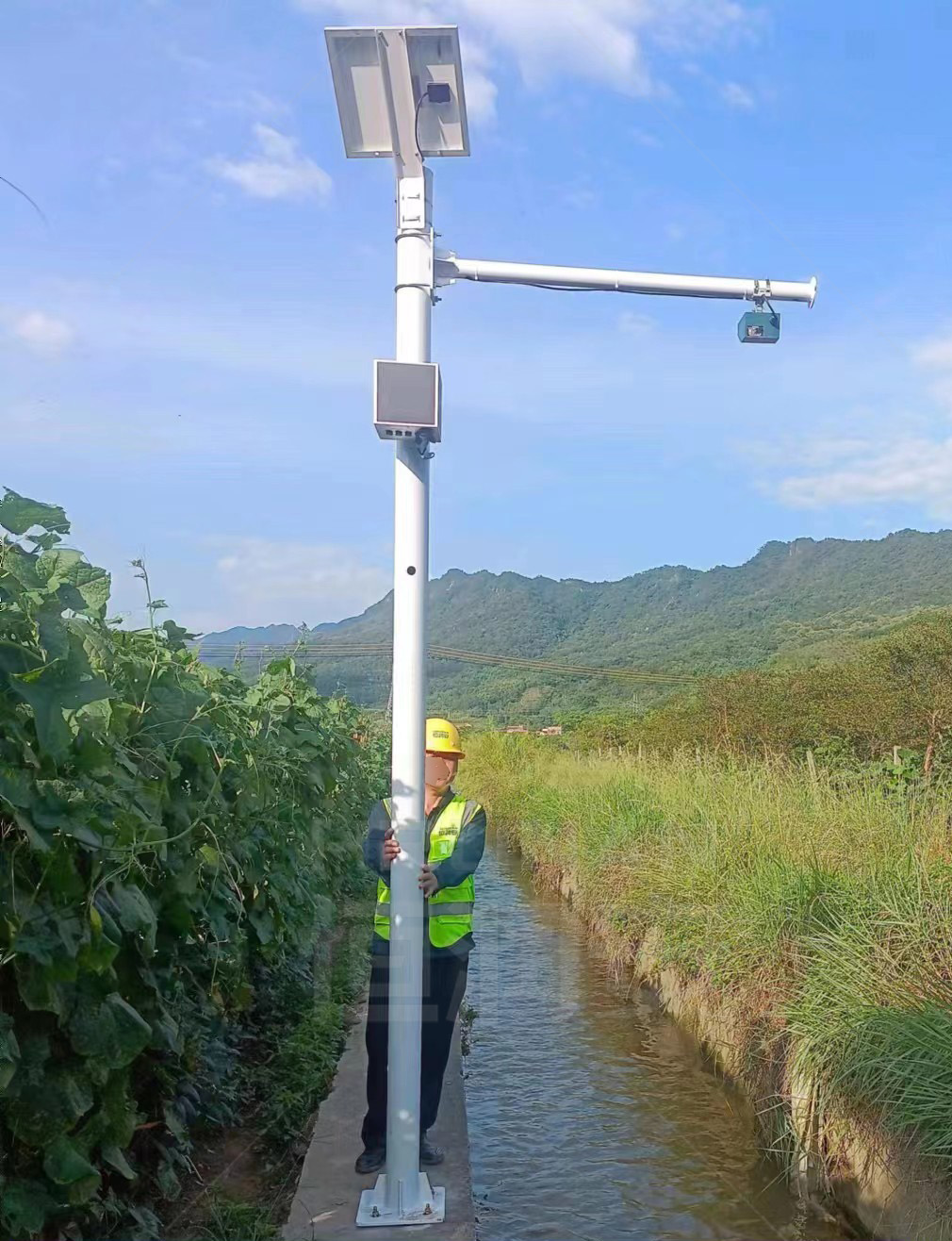 站点采用立杆式安装,终端箱挂于杆身,杆架顶部挂载太阳能充电系统,横杆下部悬挂雷达流速仪,可悬挂网络摄像头用于监控现场环境。