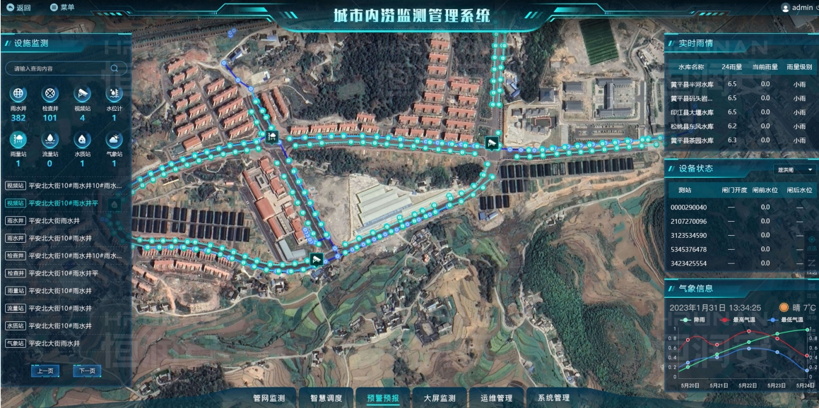 通过三维建模实现可视化,实时监测积水、降雨量,融合气象云图、雷达图进行未来降雨、积水预测推演,与预警中心形成一套完整的监测预警平台。