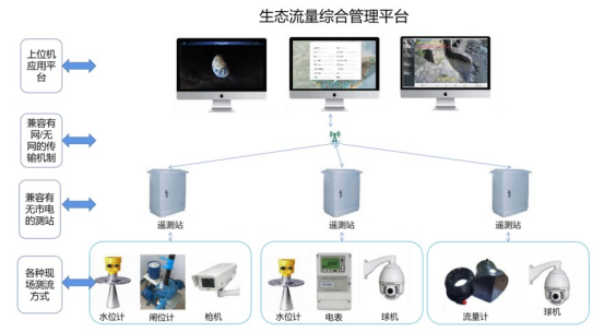 生态下泄流量监测系统的建设分为定性监测和定量监测,包括视频监测、图像监测和实时流量数据监测等监测方式。定量监测是指根据各小水电站实际拦水坝和引水渠道的情况选择合适的测流方法实现下泄流量数据的实时计量和监测;定性监测主要根据网络信号条件进行选择视频监测或图像监测将像头对准下泄流量泄水口,并看清下泄口出水画面定性监控。系统监测拓扑图如下: